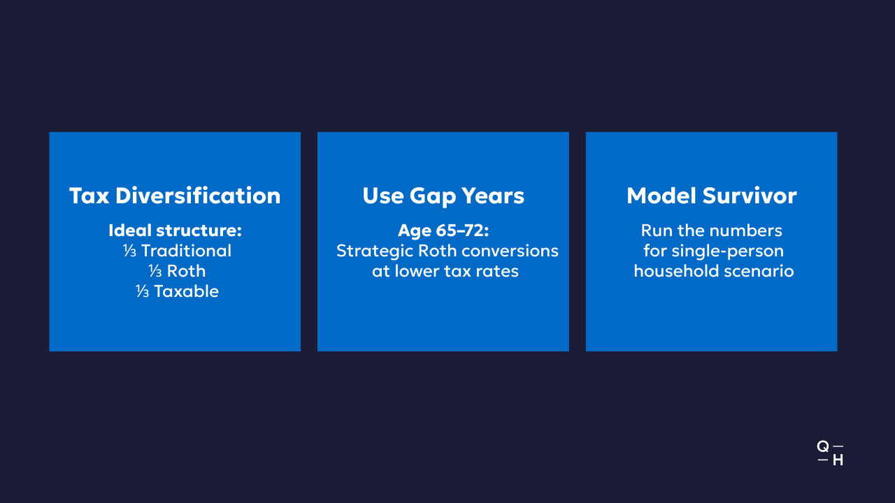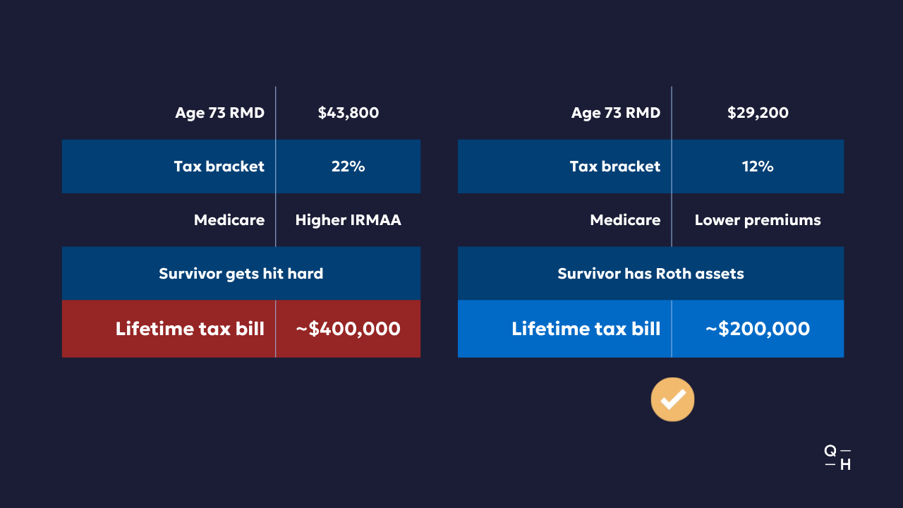 They stay in a lower tax bracket. Medicare premiums stay lower. And when one spouse passes away, the survivor has more Roth assets to draw from tax-free.