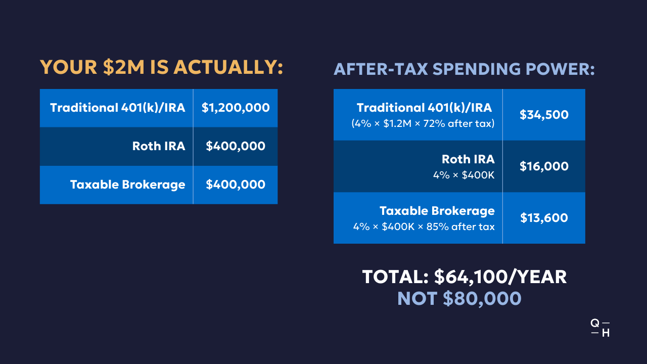 So when you look at that $1.2 million in traditional accounts and think "$48,000 per year using the 4% rule," you need to reduce that by 28%. Your actual spendable amount from that portion? About $34,500 per year.