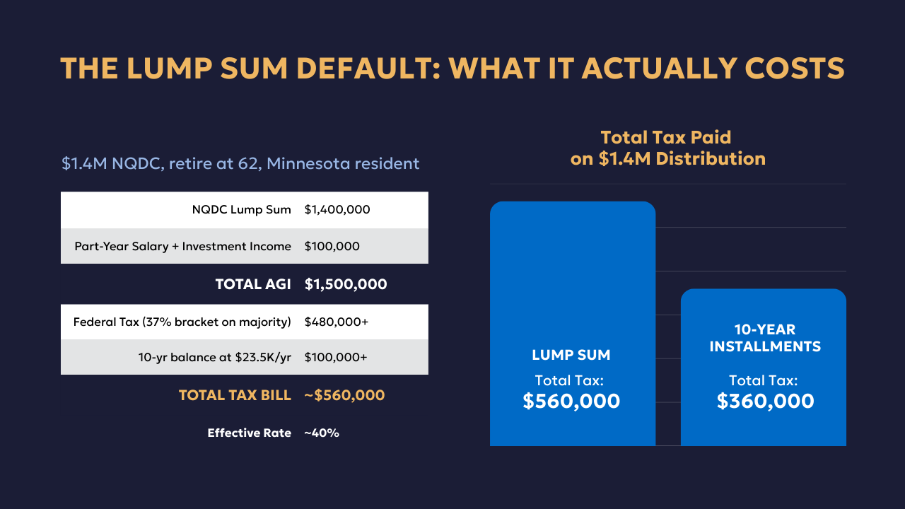 David is 59, VP of Operations at a medical device company in the Twin Cities, 21-year tenure, $1.4 million in his NQDC plan. He enrolled at 42 and kept the default lump sum election without giving it much thought.