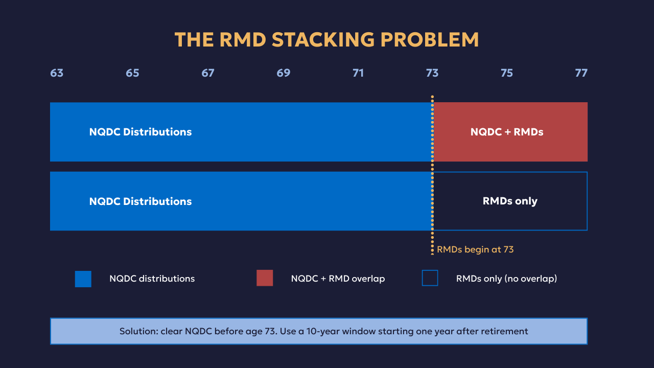 The second trap is letting installments run into your RMD years. If you retire at 62 and take 15-year installments, distributions run to age 77. Required minimum distributions start at 73. From that point forward, NQDC installments stack on top of RMDs, potentially forcing income above $400,000 at exactly the ages when you least want a tax surprise.