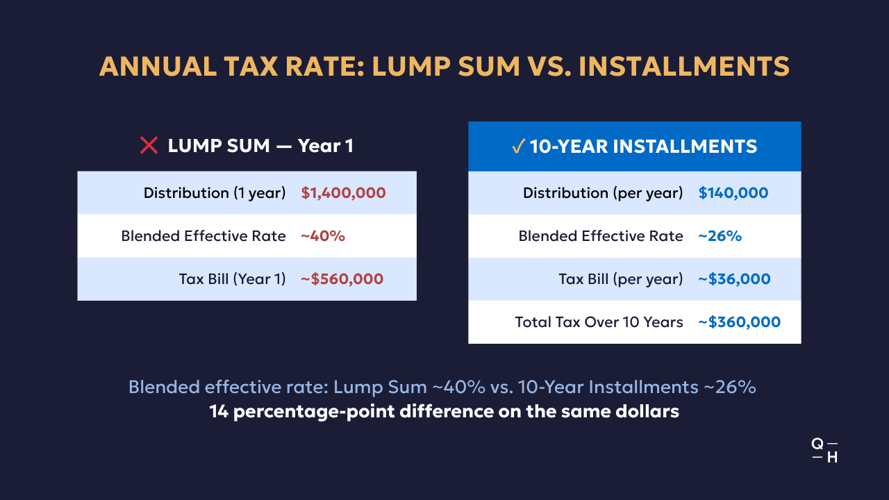 Now compare that to 10-year installments. At $140,000 per year with moderate other income on a joint return, your effective rate drops to the 24% to 26% range. Tax on $140,000 at a 26% blended rate is roughly $36,000 per year, or $360,000 over ten years.