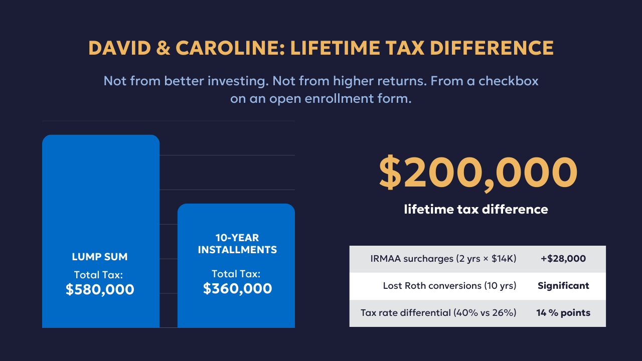 The lifetime tax difference between David's current lump sum election and the installment alternative is approximately $200,000. Not from better investing. Not from different returns. From a checkbox on an open enrollment form.