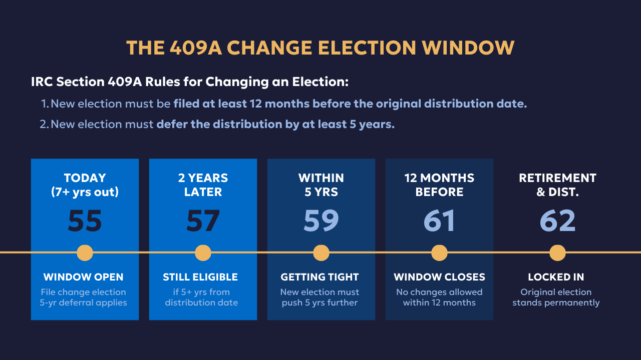 If you are seven or more years from retirement, this window is genuinely useful. If you are 55 and you realize your election does not work for your situation, you can file a new one today. As long as the distribution does not start for at least five years, the change is valid under 409A.