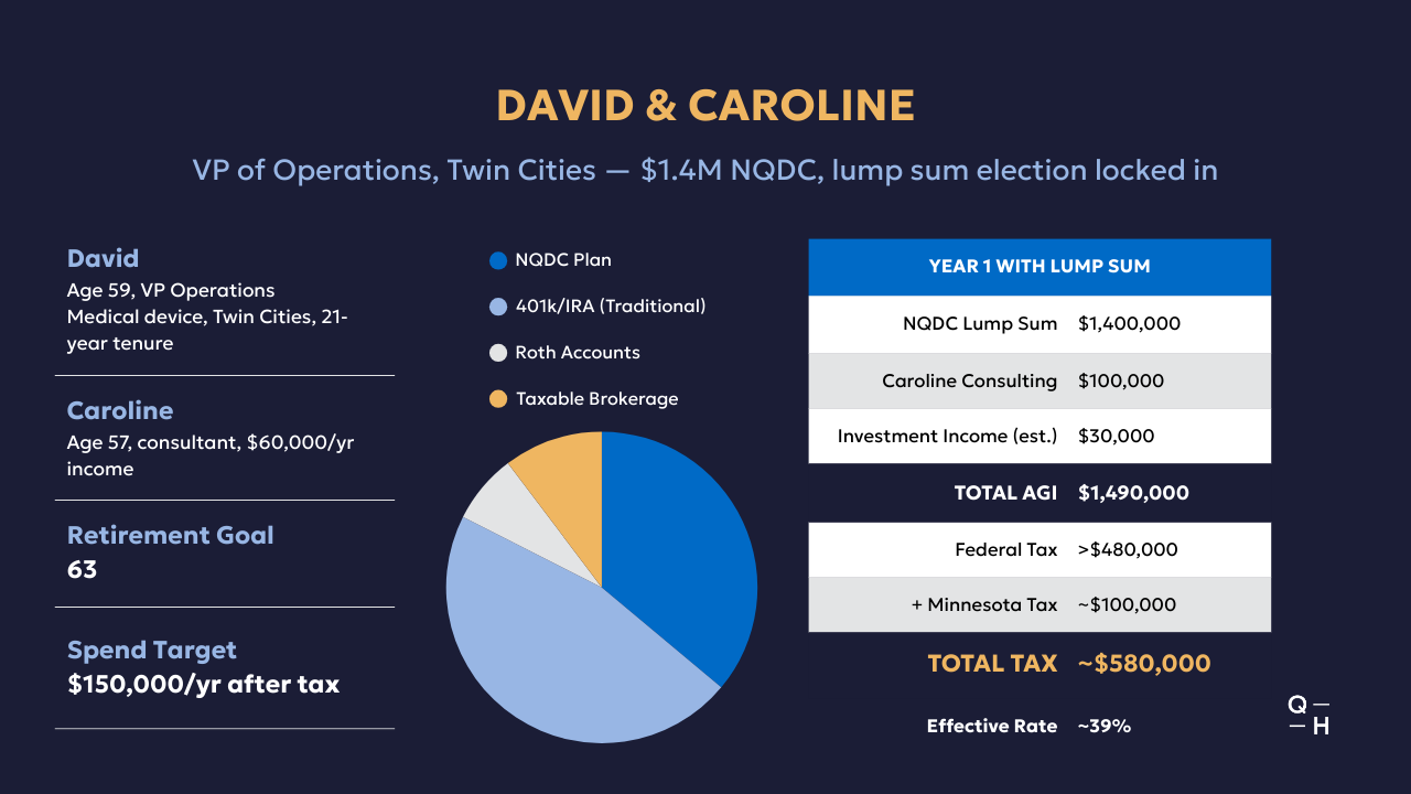 With his current election intact, year one of retirement looks like this: $1.4 million NQDC lump sum, plus $60,000 from Caroline's consulting, plus roughly $30,000 in estimated investment income. Total adjusted gross income: $1.49 million. Federal tax alone exceeds $480,000. Add Minnesota and the combined bill is close to $580,000 at an effective rate of about 39%.