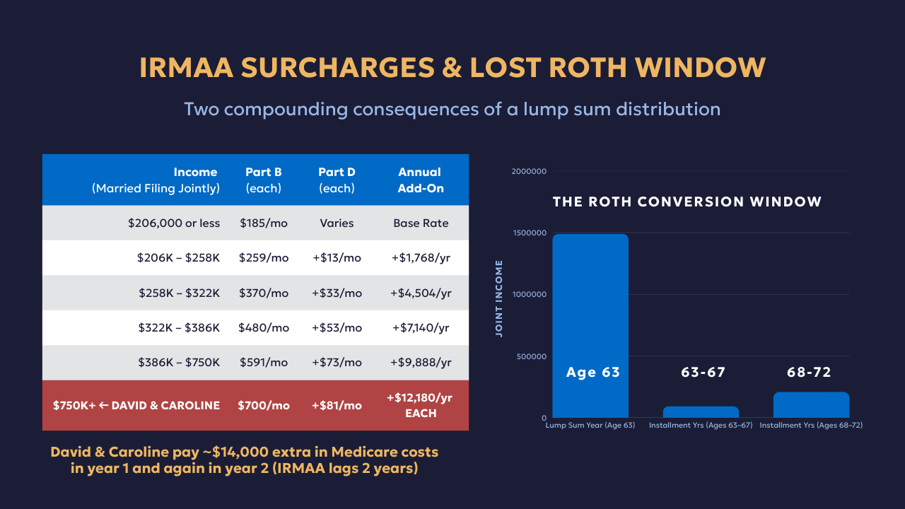 First, Medicare looks back two years to determine IRMAA surcharges. At $1.49 million in income, David and Caroline hit the highest IRMAA tier, roughly $7,000 per person per year above the base premium. That is $14,000 in additional Medicare costs, and it follows them into year two of retirement even though the distribution is gone.