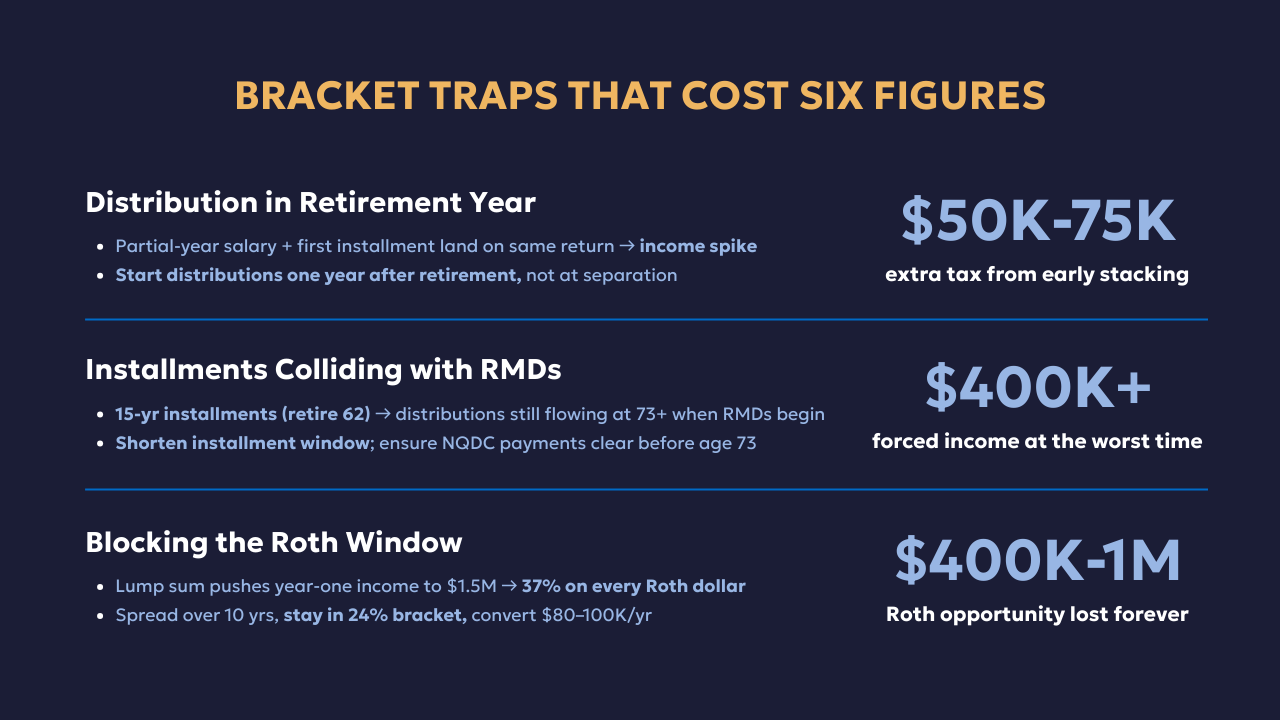 The first trap is starting distributions in your retirement year. If you retire mid-year and distributions begin at separation from service, your partial-year salary and the first installment land on the same return, creating an income spike that pushes you into a higher bracket unnecessarily. Starting distributions one year after retirement avoids this entirely.