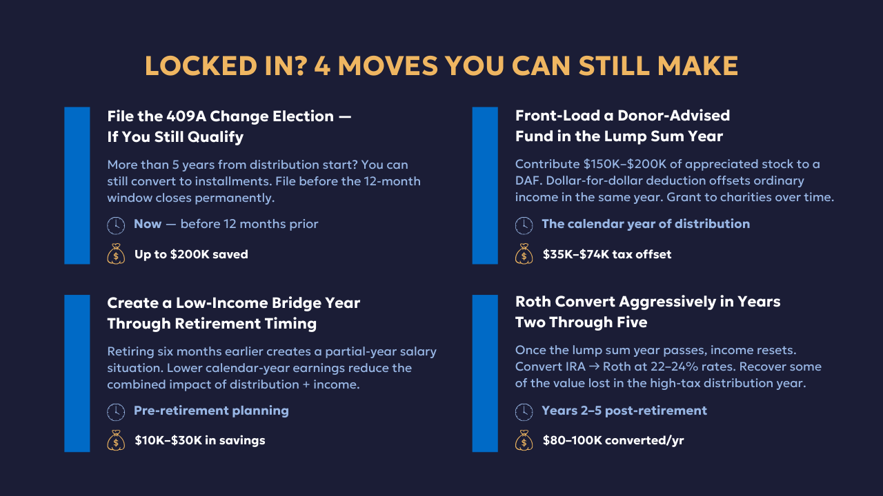 Move one is to file the 409A change election now if you qualify. If you are more than five years from your original distribution start date, you can still switch to installments. This window closes permanently once you are within 12 months of the distribution date. Work with a CFP who understands 409A before this option disappears.