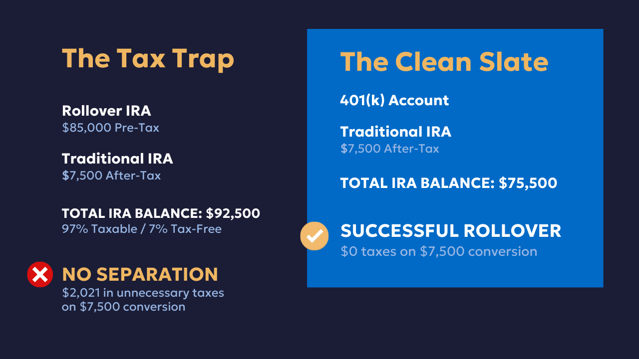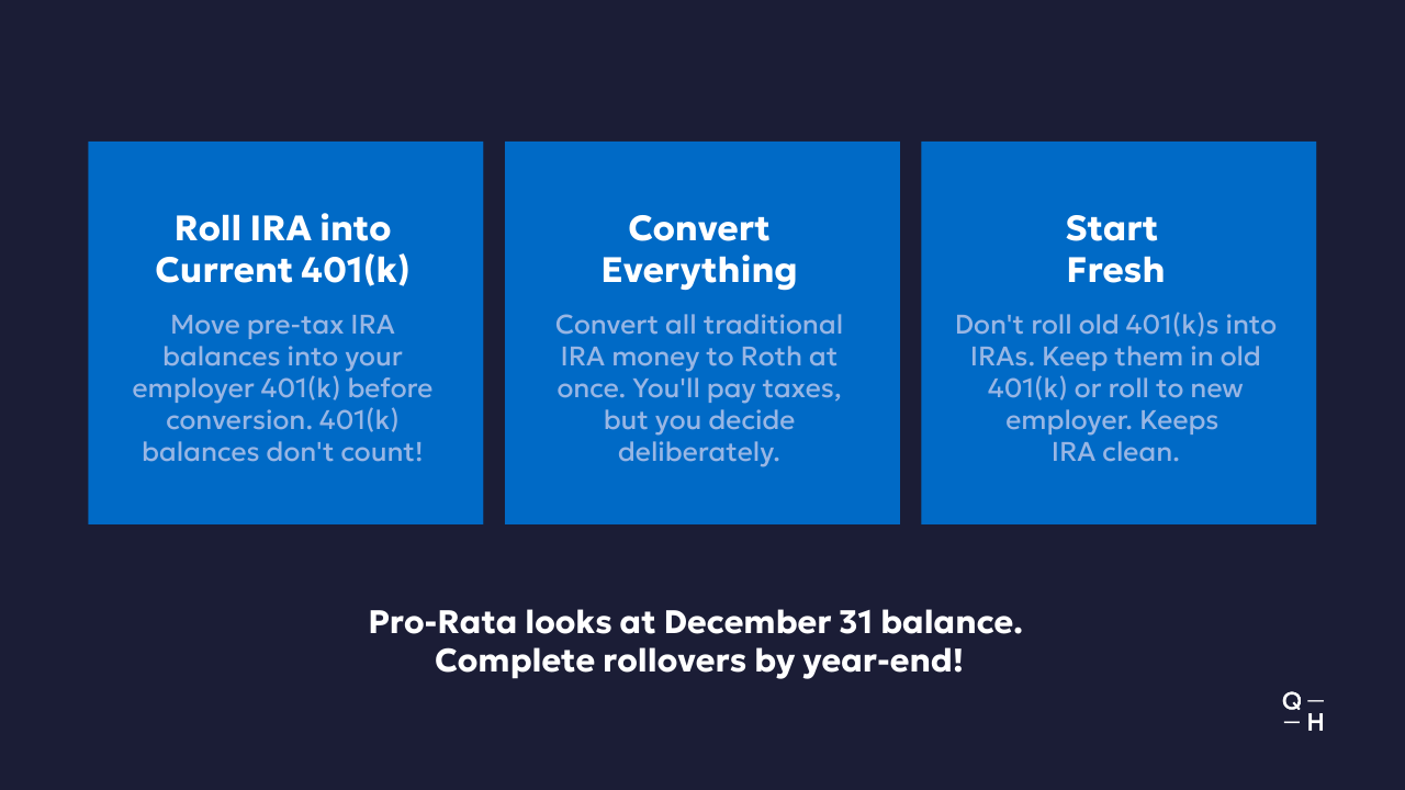 December 31 matters: The pro-rata calculation uses your IRA balance as of December 31 of the conversion year. Complete any rollovers to your 401(k) before year-end.