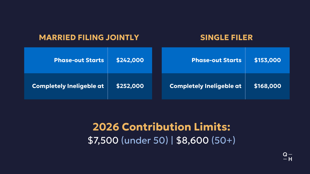 In 2026, you can contribute up to $7,500 to a Roth IRA if you're under 50, or $8,600 if you're 50 or older. But only if your income falls below certain thresholds.